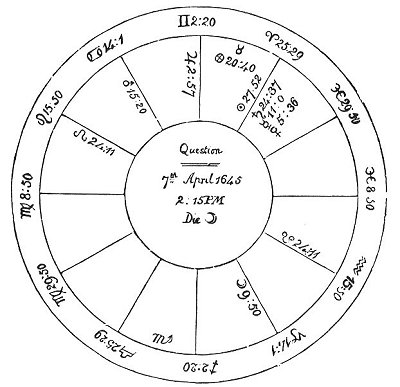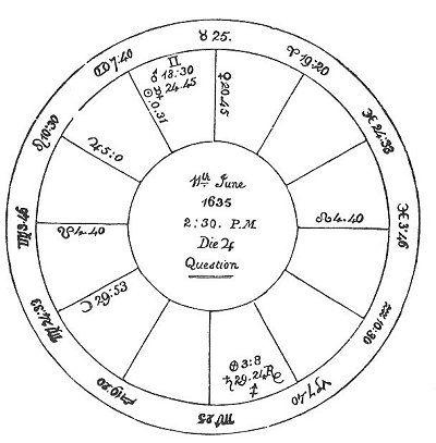 terms of ♂, and in ☐ to ♄, lord of the 5th. ☿, lord of the ascendant, is in the terms of ♄, and afflicted by ♂, and going to ☍ of ♄, who is lord of the 6th as well as 5th; also in the ascendant. All these are strong arguments of barrenness; and I therefore delivered the following judgment, viz., that the querent neither had been, nor ever would be, pregnant, being naturally barren; for finding the chief angles afflicted by malefics, it was certain that the evil which prevented her from conceiving had been long upon her, and would continue. I found no one promising testimony; so I declared, positively, that she never would have any children, according to the rules of the science.