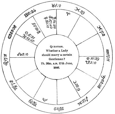 ☿ is here the querent's significator, and being retrograde, and under the beams of ☉, shewed that she was in distress and fear that the quesited would not have her. And she had some reason for it; for ♃ was in his exaltation, and near the ✶ of ♀, an argument that the man stood upon high terms, and had been tampering with another: yet, as both significators were in semi-sextile aspect, and in good houses, I gathered hope that there were some mutual sparks of love. And when I found ☽ separating from ☐ of ♃ and hastening to △ of ☿, thus conveying the light of the quesited's significator to the lord of the ascendant, which he received willingly by his retrograde movement, I was confident that the match would be suddenly brought about by a person described by ☽; who did, indeed, though with a little difficulty, produce the marriage to the content of both parties.