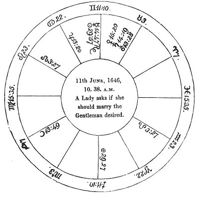 fortune, and ever assisting nature and the afflicted, and that he was able to take off the malice of ♄; I was confident, from the exactness of the aspect, that the quesited was intimately acquainted with a person of rank and worth, (such as ♃ represented), whom I exactly described, and the lady very well knew. I directed her to apply to him, and acquaint him with the full extent of her folly, and I assured her that in him she would find all honour and secrecy; and I doubted not but, by God's blessing, he would again revive the business, and bring her to her heart's content. But finding that ☉ and ♄ came to ✶ aspect on the 27th of the month, I advised to hasten all before that aspect was over; and as on the 19th of June ♄ and ♃ came to a ✶, I told her that the gentleman should first move the quesited on that day near noon. My counsel was followed, and by that gentleman's means the match was brought on again, and completed within twenty days, to the content of the sorrowful (but to me unthankful) lady, &c.