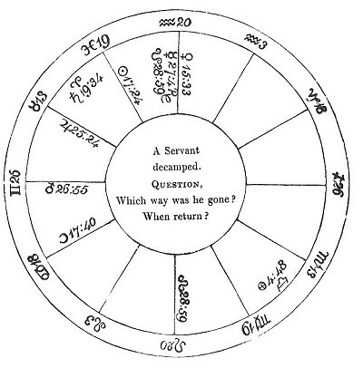 I observed that he went away from his master the preceding Sunday, when ☽ was in ♊, a western sign, where ♂ now was; and that ☿, the common significator of servants, was in ♒, a western sign, but south quarter of heaven.