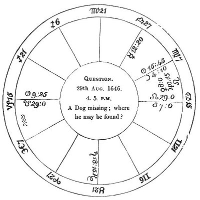 The sign ♊ is west and by south, the quarter of heaven westerly; ☿, the dog's significator, is in ♎, a western sign, and is in a south-western quarter of heaven; the ☽ is in ♍, a south-west sign, verging to the west angle. The plurality of testimonies shewed that the dog ought to be west from where the owner lived, which was at Temple-bar; therefore I judged that the dog was about Long Acre, or upper part of Drury Lane. As ☿ was in a sign of the same triplicity with ♊, which signifies London, and applied to △ of the cusp of the 6th, I judged that the dog was not out of the lines of communication, but in the same quarter; of which I was more satisfied by the △ of ☉ to sa. ☿ being in an airy sign, I said the dog was in some garret or upper room; and, as ☽ was under the beams of ☉, and ☿, ☽, and ☉ were in the 8th house, that he was kept privately, or in great secrecy. But as ☉, on the following Monday, formed a △ to ♂, lord of the ascendant, and ☽ formed a △ to ♂, who has dignities in the ascendant, I intimated that he should then have news of his dog; and this proved true; for a gentleman of the querent's acquaintance, coming accidentally to see a friend in Long Acre, found the dog chained up under a table, and knowing him to belong to the querent, sent him home about ten o'clock on the Monday morning, to my very great credit.