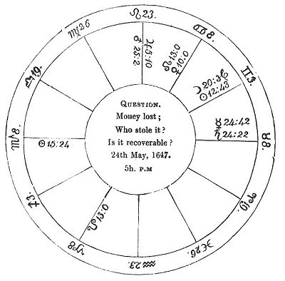 Thus you see, that the peregrine planet in an angle describes the thief; and that either ☉ or ☽ in the ascendant gives assured hopes of discovering who it was. The ☽ applying to the lord of the 2d, argues recovery; if they both be essentially dignified, complete; but if accidentally fortified, partial. If both be peregrine, and they apply, there will be a discovery, but no recovery.