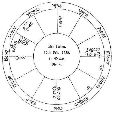 Living in the country in 1637, I had bought at London some fish for my provision in Lent; it came down by the barge to Walton. On Saturday, the 10th February, one of the watermen, instead of bringing my fish home, acquainted me that their warehouse was robbed last night, and my fish stolen. I took the exact time I first heard the report, and erected this figure accordingly; endeavouring to give myself satisfaction as to what became of my goods, and, if possible, to recover part or all of them.