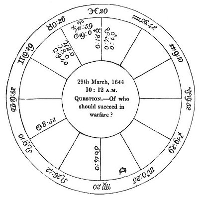 given to the friends and assistants of the enemy. There are only ♂ and ☋ in the 9th; so it appears that Sir Ralph had no supplies ready to attend that day's success, &c. From the ☽, having principal signification of us and our army, being in her exaltation with ♃, I concluded all was and would be well on our side, and that the victory would be ours. From her separation from ♃, I said, I verily conceived that we had already taken some ammunition from them, or performed some service against them. This I was confirmed in by ☉, lord of our substance and assistants, being posited in the 10th house, in the very degree of his exaltation; (the 19th). And though I thought by the proximity of ♄ to ☉ we should not gain the whole, or have a perfect victory, without diminution of some part of it; yet I was confident we should obtain a considerable proportion of their ammunition, and have a victory, the only thing inquired after; for the ☽ applied to ♀, and then to a ✶ of ☿, he being angular. I told the querent that within eleven or twelve hours after the question we should have perfect news, and it satisfactory. For, considering that the fight was within fifty miles of London, I ordered my time with discretion, not allowing days for the time, but hours; and this because ☽ is distant from ♀ 11°, but is withal swift in motion, and increasing in light. These were also signs of our success, and the enemies' defeat. It appeared, by a letter from the army on that same Friday, that our generals took on the previous day 120 commanders and gentlemen, 560 common soldiers, and much ammunition. Thus the enemy was worsted, as appeared by ♄, (the Lord Hopton's significator), being sub radiis, in his fall in no aspect to any planet, wholly peregrine, and unfortunate, and aspecting the cusp of the 7th by ☐. All this argued that he would bring loss to his army, and dishonour to himself by the fight, &c.