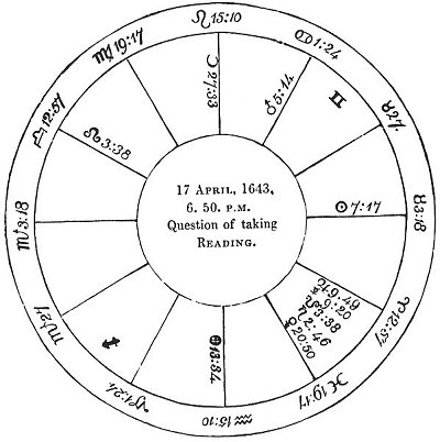 The significator of his Excellency ♂ is well fortified, and afflicted in no way but by being in his fall. This figure manifests that it is of great importance in questions of warfare to have ♂ friendly to the querent. The ☽ separated from nothing, and was void of course; and, indeed, there was little hope of its being gained in the time it was. She applied to ✶ of ♂ from signs of long ascension, which was equivalent to a ☐; which argued that his Excellency would have much difficulty and some fighting ere he could get it. But as ♂ and ☽ were in reception, viz. ♂ in her house, and she in his terms and face, and near Cor. ♌, and in the house of honour, I judged that his Excellency would obtain and take Reading, and gain honour thereby. Finding ☉, his Majesty's significator, in the 7th in a fixed sign, I said that he would send forces to relieve the town, and oppose all he could; but that he would not prevail, as ♂ was better fortified than ☉. The King did come in person, and was beaten back at Causham Bridge.