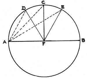 degrees 1 These several distances are taken for the following reasons: the distance by diameter, however, is in itself sufficiently clear, and requires no further explanation; but, as to the rest, after the diametrical points have been connected by a straight line, AB; the space of the two right angles, contained on the diameter, is then to be divided into aliquot parts of the two greatest denominations; that is to say, into halves, AFC, CFB, and into thirds, AFD, DFE, EFB: there will then be provided for the third part (AD) a super-proportion (DC), equal to its own half; and for the half (AC) a super-proportion (CE), equal to its own third part; so that the division into two aliquot parts,