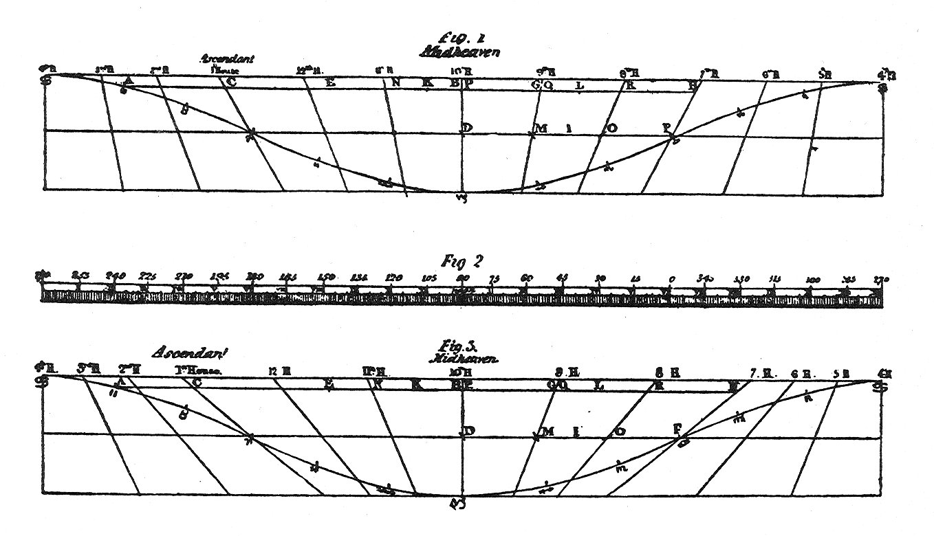 Fig. 1 is the Planisphere adjusted for the northern latitude of 30° 22' (where the longest day consists of fourteen equatorial hours), agreeably to the "Exemplification" given by Ptolemy in Chapter XV, Book 3. It represents that portion of the celestial sphere which is contained between the tropics: the central horizontal line is the equator; the curved line extending longitudinally from east to west is the ecliptic; the central perpendicular line is the meridian, or cusp of the 10th house; the other short lines, cutting the equator transversely, are the cusps of the other houses; that of the 1st house being the eastern horizon; that of the 7th, the western horizon. Hence, the distance from the 1st house to the meridian, or from the meridian to the 7th house, shows the semi-diurnal arc of any parallel of declination in the ecliptic; and the distance of the 7th house to the 4th, or from the 4th to the 1st, shows the semi-nocturnal arc. The distance from the cusp of one house to that of the next, taken on the same parallel, is also equal to two