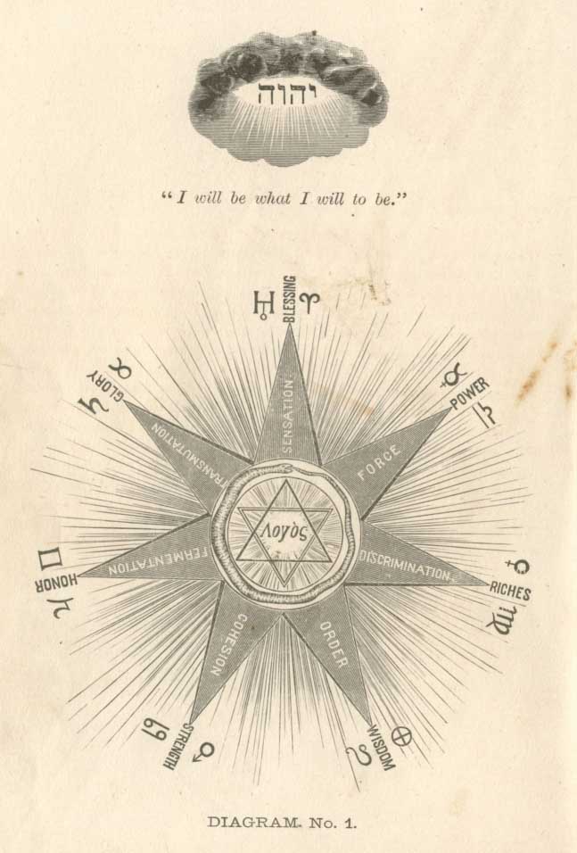 This Diagram is a formula expressing the creative energies of the Word, or Logos, the Greek of which is given in the centre of the star. The double triangle expresses the dual relation of the creative forces,as male and female,the ancient term of expression being theos-sophy. Their triune expression is, first, Spirit; second, Body; third, Soul. The seven points of the star are expressive of the seven primate creative principles, as named on the respective points; and when man conquers or subjugates these principles to the higher will within himself, he then attains the ultimates which stand expressed against the seven points. These seven creative principles are found to have their solar expression in the seven planets made use of in this system, and the different planetary signs are placed against their appropriate point, or principle, in juxtaposition to the sign of the zodiac in which they find their most natural or perfect expression. These seven points are called the seven vital principles. The body of man, being an epitome of the solar man, or nature, cannot exist without having these seven principles in working order, while he can live without the five serving principles provided he be served by others. The serpent encompassing the triangles is expressive of the circle of eternity, also of the psychic or sex principles of nature, which is active in the work of creation or generation.