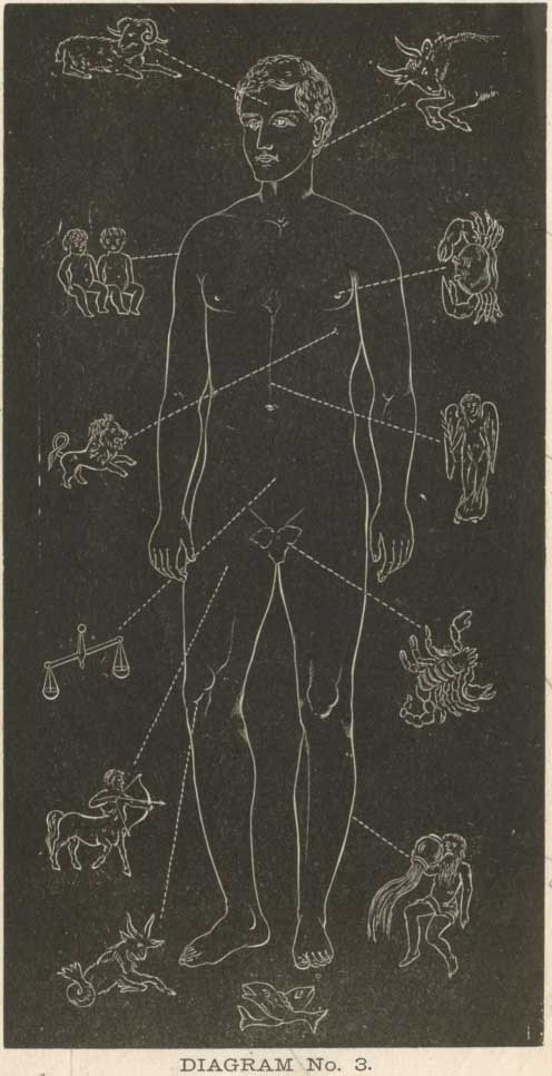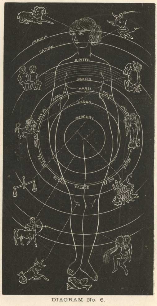 The above diagram gives a combined expression of the relation which the signs of the zodiac sustain to the different portions of the body, and also of the natural position and relation of the seven planets to the seven vital functions of the system. The form of woman is selected, as being the mother principle and mould of all things.