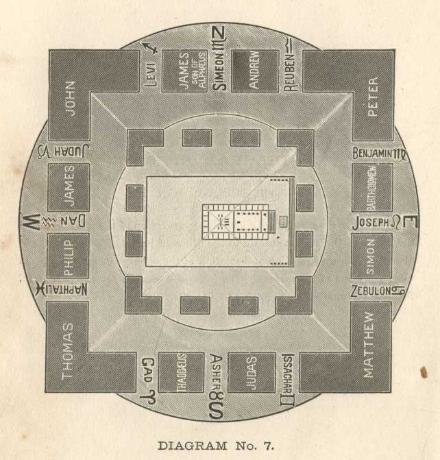 The picture of the Temple and arrangement of the controlling influence of the heavens in the earth, as seen by John (see Revelations xxi.). The above gives the twelve gates of the Temple in their respective trinities, with the name of the corresponding tribe and sign to which they belong; also the twelve foundations, with the names of the twelve apostles of Jesus. The letters N., S., E., W., are North, South, East, West. The circle is squared by the perfect law of God in its triune relation: first, or outer circle, the physical body; second, the soul; third, and innermost, the spiritual. This being squared by the perfect law, is a perfecting of the effort made by Solomon to carry out the injunction given to Moses: "See that thou make all things after the pattern shown thee in the mount. . . . The pattern of the heavens."
