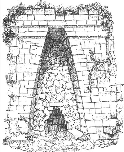 "The base of these treasure-houses is circular, and the covering of a dome shape; it does not, however, form an arch, but courses of stone are laid horizontally over one another in such a way that each course projects beyond the one below it, till the space at the highest course becomes so narrow that a single stone covers it. Of all those that have survived to the present day the treasure-house at Atreus is the most venerable."