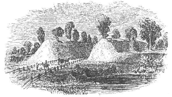 and intricate works: they occupy an area two miles square, embraced within embankments twelve miles long. One of the mounds is a threefold symbol, like a bird's foot; the central