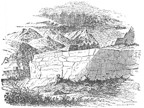 At Cuelap, in Northern Peru, remarkable ruins were found. "They consist of a wall of wrought stones 3600 feet long, 560 broad, and 150 high, constituting a solid mass with a level summit. On this mass was another 600 feet long, 500 broad, and 150 high," making an aggregate height of three hundred feet! In it were rooms and cells which were used as tombs.