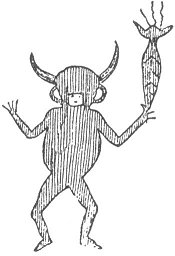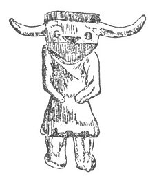 And when we cross the Atlantic, we find in America the horns of Baal reappearing in a singular manner. The first cut on page 429 represents an idol of the Moquis of New Mexico: the head is very bull-like. In the next figure we have a representation of the war-god of the Dakotas, with something like a