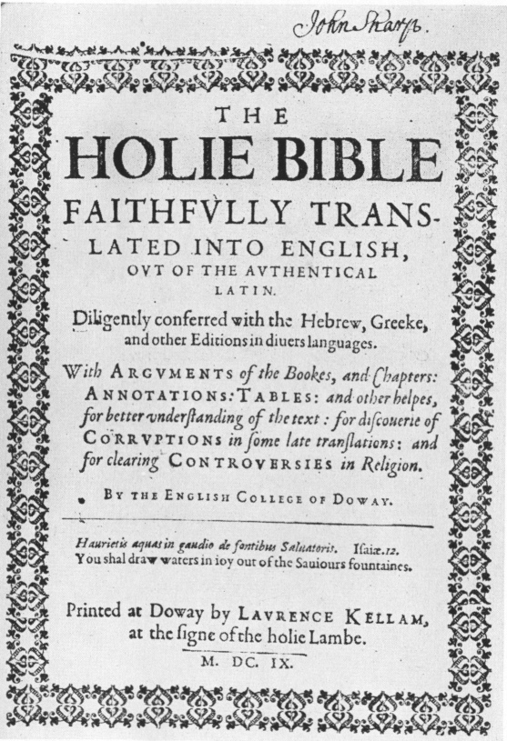 in accordance with the textual changes noted above, it was brought out at Douai. As polemical in purpose as the "Geneva Bible" or the "Bishops’ Bible," changing "cup" to "chalice" and "repentance" to "penance," its renderings were sanctioned by the Roman Catholic Church whose members were forbidden to read the Protestant translations. The chief editor, Gregory Martin, and his colleagues, William Allen and Richard Bristow, were competent scholars but they were not really in sympathy with the purpose of their own work. As if to emphasize their contempt for the vulgar herd they deliberately adopted a heavily Latinized style which obscured the meaning. Thus, for example, the phrase "He humbled himself" became "He exinanited himself." Similar words virtually unknown to the English language outside of the "Douai Bible" are "colinquination," "correption," exprobate, "obsecration," "scenopegia." A Protestant taking up the "Douai Bible," with its unfamiliar headings such as First and Second Paralipomenon, Osee, Micheas, Sophronias, and Aggeus, will feel that he is reading a different work from the Bible that he has always known. In one respect, however, the "Douai Bible" was much superior to the later Protestant versions from the literary point