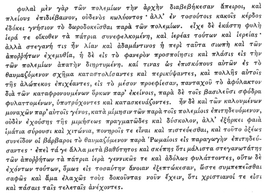 In the above extract, note (i) that the religion is τὰ πάτρια ἱερά, a faith brought with them from Central Asia; (ii) that the institution of quasi-bishops seems to be spoken of as a recent innovation, and that it corresponds in point of time with what we know of Chinese ordinations'; (iii) that black (φαιός) suits what we know of Shinshū and Jōdo monks; (iv) that it corresponds with what we know from other sources about the confusion between Buddhist arhats and Christian "saints." The object of the ruse was to deceive the Romans into believing that the barbarians were already Christians. The work of Ulfilas came later, at any rate in its influence, and his institutions could not be described as being "ancestral rites" of the Goths.
