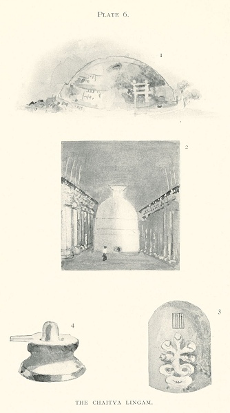A rough sketch (Pl. 6) shows how this was done. Above (Fig. 1) is an early cairn, like the Sanchi Tope. Then (Fig. 2) I give the early Lingam, which was a large block of bed-rock, left when excavating a cave-temple. Fig. 3 is a miniature dome-chaitya, the old relic-mound made into Siva's emblem. In Fig. 4 we get the "Jew's harp," as it is called, the Lingam to be seen in every bazaar.