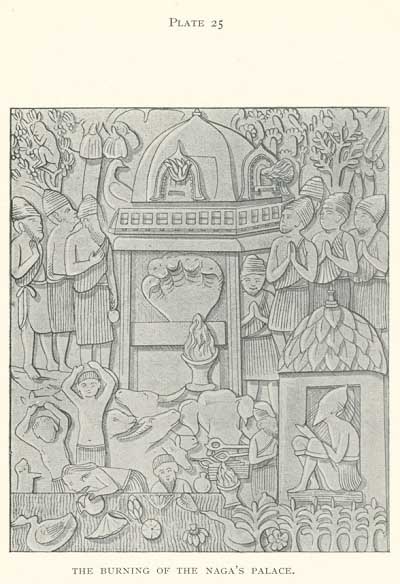 already. Buddha visits Samana Deva Rajah in his palace in hell. He frightens all his Nâgas to death by making fire issue from four sides of the palace. The Nâgas are the ancient rulers of Ceylon, and the Nâgas are to this day a sect of Siva. Probably in early times it was a generic title. The five-headed serpent (Pl. 25) is the Serpent King, with his fire altar and crowd of bullocks and other victims, which include I fear, two little boys. There is wood piled, and a second brazier is in the corner. Buddha's object, we must recollect, was to secure the Minne Phalange, or "Seat of Supremacy." In one corner of the Plate is Buddha working his magic under a Pan-sil. The Kûsa grass mat of the ascetic was called the Throne of the Bodhi (Bodhi mandi).