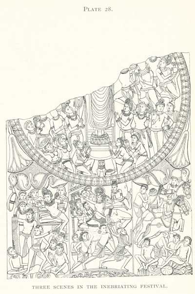 My interpretation is different. It seems to me that the man that Mr. Fergusson takes to be an orator is about to strike off the head of the young man by him with a weapon very like the Kukri of the Nepaulese, a weapon that can sweep off a buffalo's head at one blow. The victim is tied to a post. A darikhâna, with jewelled throne and costly cushions, is hardly the place for a commonplace execution; and the young man is handsome and calm. This suggests a willing victim, as was required in the Sivan mysteries. In fact, we have here the great Inebriating Festival.