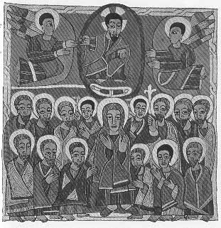 Christ ascending into heaven and being received by angels. Below are the Virgin Mary and the Apostles