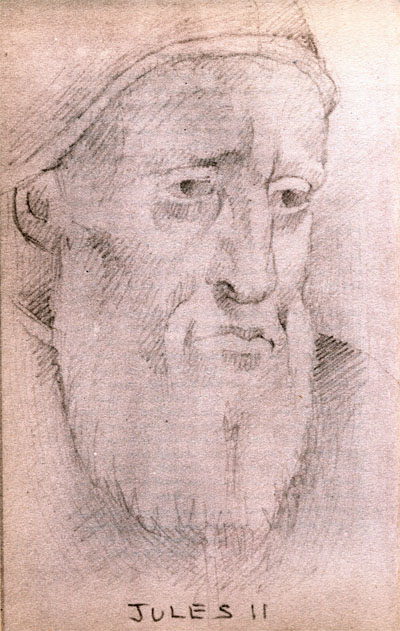 There was no deadlock at the next conclave for by bargain and by bribe Cardinal della Rovere secured for himself thirty-seven of the thirty-eight votes in proceedings that did not extend a full day. After long years he had finally won the tiara and triumphantly taking the name of Julius II he set out to restore the strength and possessions of the Papal States. This was no easy task, for Alexander had left a sad confusion of debts and trouble, and great properties rightfully belonging to the Church were in the clutches of his son. The Republic of Venice was noisily claiming Romagna, Spain was occupying Sicily and Naples, and the French, ever resolved to maintain a foothold in Italy were willing to resort to arms against any who would oppose them. Julius had been given a domain bankrupt in treasury and bereft of defence but not for nothing had he earned the description of terrible. He was possessed of enormous physical strength and had the courage of a lion, and his will and determination matched both these qualities. His abilities were those of a warrior statesman rather than those of an ecclesiastic but they were talents appreciated by the Romans at this time. He was not a saint and three daughters were testimony that his earlier life had been no better than that of other Renaissance prelates; but, although he had a few relations in high places, the charge of nepotism has never been levelled against him. He won, it is true, elevation to the chair of St. Peter by dubious tactics but once enthroned he acted