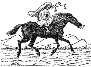 When the "THIRD SEAL" was broken John heard the third or "Man-like Living Creature" say--"Come," and a "BLACK HORSE" appeared and went forth, whose Rider held in his hand a "pair of balances," and John heard the voice of an invisible person in the midst of the "Four Living Creatures" say--"A measure of wheat for a penny, and three measures of barley for a penny, and see thou hurt not the oil and the wine." The "BLACK HORSE" signifies famine, and the Rider the "Conserver of Food." When all able bodied men are drafted for war, and no one left to sow and harvest the crops, then famine is sure to follow. So great will be the famine, that it will take a "denarius" a day's wages, to buy a "choenix" (2 pints) of wheat," the daily ration of a slave. What is meant by not hurting the oil and wine, may be, that as the Olive tree and grapevine do not bear their fruit until some months after the wheat and barley harvest, and grow without much attention, their crops would not be so much affected by war, and therefore the Olive trees and grapevines were not to be ruthlessly destroyed by invaders for they were needed for medicinal purposes.