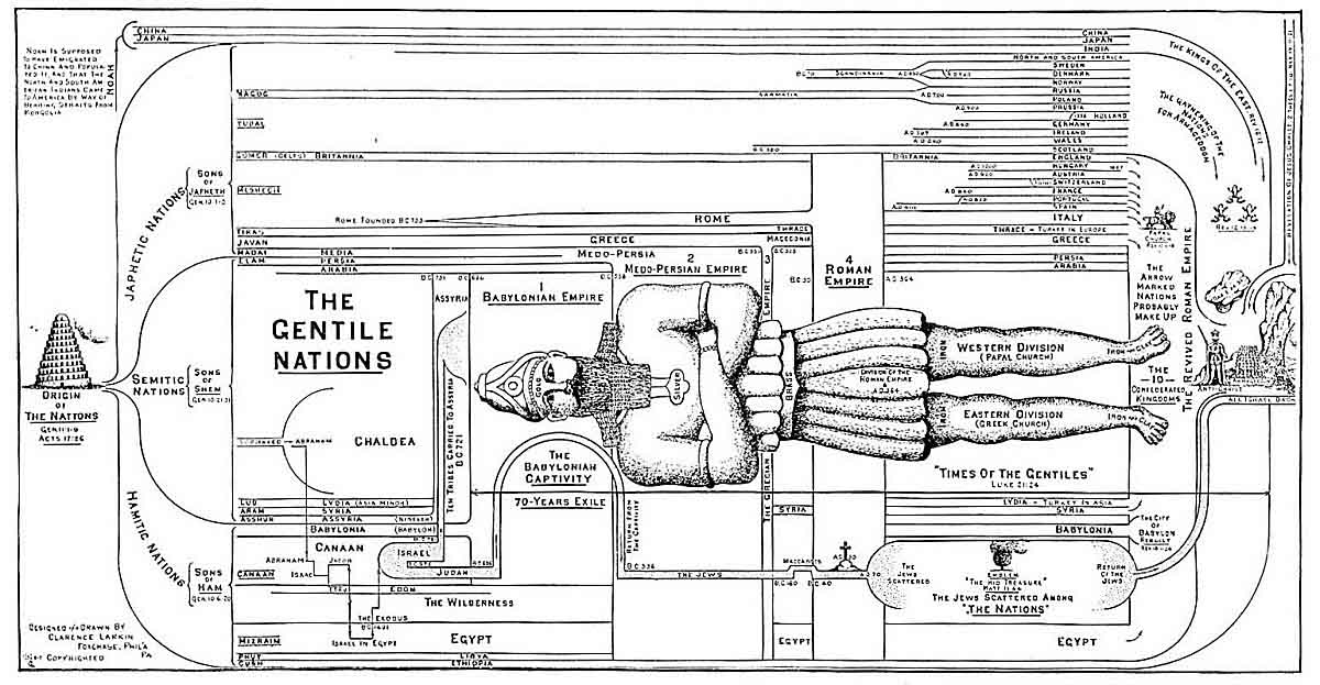 will be merged into a "FEDERATION OF TRUSTS," at the head of which shall be a "NAPOLEON OF CAPITAL." Ultimately this "Federation of Trusts" will extend to the whole world, at the head of which shall be THE ANTICHRIST, and the producer and consumer will be powerless in the tentacles of this OCTOPUS, and no man shall be able to BUY or SELL who has not the "MARK OF THE BEAST" either upon his "right hand" or on his "forehead." This "Mark" will be BRANDED or burnt on. It will probably be the "NUMBER OF THE BEAST" or "666." The number "666" is the "NUMBER OF MAN," and stops short of the perfect number SEVEN. Man was created on the SIXTH day. Goliath, the opposer of God's people, a type of Satan, was 6 cubits in height, he had 6 pieces of armor, and his spearhead weighed 600 shekels. 1. Sam. 17:4-7. Nebuchadnezzar's Image, a type of the "Image of the Beast," was 60 cubits in height, 6 cubits wide, and 6 instruments of music summoned the worshippers. Dan. 3:1-7.