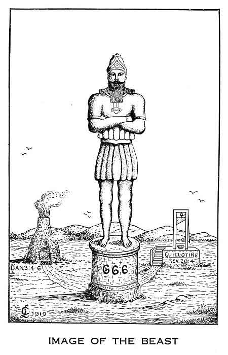In that day men will doubtless prefer to have the "MARK" on the back of their right hand so it can be readily seen in the act of signing checks, drafts, and receipts. There will doubtless be public officials in all public places of business to see that no one buys or sells who has not the "MARK." This will apply to women as well as men. No one can shop, or even buy from the huckster at the door, without the "MARK," under penalty of DEATH. Those will be awful times for those who will not WORSHIP THE BEAST. If they can neither buy or sell without the "MARK," they must beg, or starve or be killed. The instrument of death will be the guillotine (Rev. 20:4), and the daily papers will contain a list of the names of those who were beheaded the day before so as to frighten the people into obedience to the law. The doom of the "Satanic Trinity" will be, that at the close of that awful time of Tribulation the Lord Jesus Christ will return, and the "Dragon," the "Anti-God," will be cast into the "BOTTOMLESS PIT" for a 1000 years (Rev. 20:1-3), and the "Beast," the "Anti-Christ," and the "False Prophet," the "Anti-Spirit," will be cast ALIVE into the "LAKE OF FIRE." Rev. 19:20.