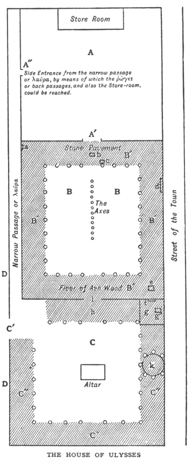 C was the outer court or αὐλή approached by C´, the main entrance, or πρῶται θύραι, a covered gateway with a room over it. This covered gateway was the αἰθούση ἐρίδουπος, or reverberating portico which we meet with in other Odyssean houses, and are so familiar with in Italian and Sicilian houses at the present day. It was surrounded by C″, covered sheds or barns in which carts, farm implements, and probably some farm produce would be stored. It contained