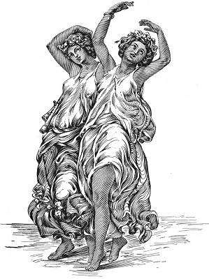 Now a sound of light footsteps pattered upon the soil and two young girls appeared, one dressed in yellow, the other in blue. They both wore the girdles of virgins which passed around the hips and tied very low upon their young bodies. It was the singer of the night past and one of the flute-players.