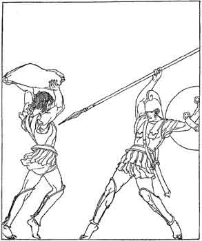 "If thy heart, Achilles," he said, "is still hard against the Greeks, and if thou wilt not come to their aid, let me go into the fight and let me take with me thy company of Myrmidons. And O Achilles, grant me another thing. Let me wear thine armour and thy helmet so that the Trojans will believe for a while that Achilles has come back into the battle. Then would they flee before me and our warriors would be given a breathing-time."