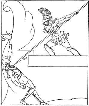 So Hector spoke. Then he lifted up a stone--such a stone as not two of the best of men now living could as much as raise from the ground--and he flung this stone full at the strongly-set gate. It broke the hinges and the bars, and the great gate fell under the weight of the tremendous stone. Then Hector leaped across it with two spears in his hands. No warrior could withstand him now. And as the Trojans scaled the walls and poured across the broken gate, the Greeks fled to their ships in terror and dismay.