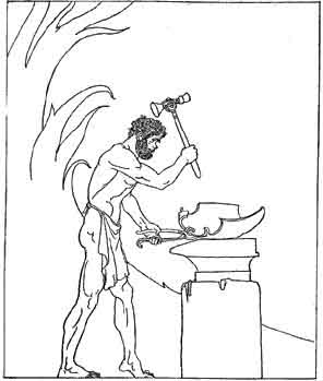 She no sooner finished speaking than Hephaistos went to his work-bench and set his bellows--twenty were there--working. And the twenty bellows blew into the crucibles and made bright and hot fires. Then Hephaistos threw into the fires bronze and tin and silver and gold. He set on the anvil-stand a great anvil, and took in one hand his hammer and in the other hand his tongs.