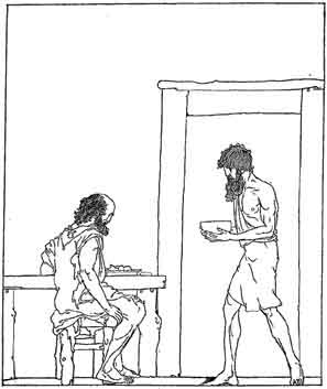 As they were speaking the younger swineherds came back from the woods, bringing the drove of swine into the courtyard. There was a mighty din whilst the swine were being put into their pens. Supper time came on, and Eumæus and Odysseus and the younger swineherds sat down to a meal. Eumæus carved the swineflesh, giving the best portion to Odysseus whom he treated as the guest of honour. And Odysseus said, Eumæus, surely thou art counselled by Zeus, seeing thou dost give the best of the meat even to such a one as I.