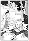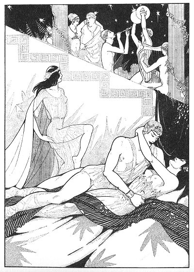 [paragraph continues] I beckoned for him to return to my side. Instead of coming back to me, he took hold of the tip of the lobe of Thais's ear and pulled her head backwards and gave her such a deep, sucking kiss that she could not free her lips from his for some time. I started to weep, but he only snickered and whispered all kinds of things to Thais. I am sure he was talking about me, because Thais regarded me and smiled. Then they heard Lamprias enter and they stopped kissing and separated. I went to lie down with Diphilos; I did not want to give him an excuse for further inattention.