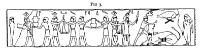 The ceremonies[2] which took place at the door of the tomb in an Egyptian funeral are of considerable interest. The priest called Kher-heb, holding the Sem priest by the arm, gives directions for the slaughter of "a bull of the South." The slaughterer, standing on the bull, cuts off a fore-leg (Fig. 3) and takes out the heart. A woman, called the Tcherauur, who personifies Isis, then whispers in the deceased's ear, "Behold, thy lips are set in order for thee, so that thy mouth may be opened." Next, an antelope[3] and a duck[4]