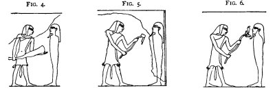unto thee thy son who loveth thee; he shall open for thee thy mouth and thine eyes." (Fig. 8). A tomb-official, Am-as, then takes up his position behind the deceased, and the Se-mer-f and the Kher-heb stand in front; the Kher-heb repeating four times: "The Se-mer-f openeth the mouth and the two eyes of the deceased, first with a needle of iron, then with a rod of smu metal"; the Am-as addressing the deceased: "Behold the Se-mer-f"; and the Kher-heb saying, in the name of the Se-mer-f: "I have pressed for thee thy mouth, even as thy father pressed it in the name of Seker. Hail, Horus hath pressed thy mouth for thee, he hath opened thine eyes for thee; Horus hath opened thy mouth for thee, he hath opened for thee thine eyes; they are firmly stablished. Thy mouth was closed; I have ordered thy mouth and thy teeth for thee in their true order. Thou hast [again] opened thy mouth; Horus hath opened thy mouth. I have stablished thy mouth firmly. Horus hath opened for thee thy mouth, Horus hath opened for thee thy two eyes." The Kher-heb then speaks on behalf of the Sem priest: "Thy mouth was closed up. I have ordered aright for thee thy mouth and thy teeth. Thy mouth is firmly stablished. Thy mouth was tightly closed. His mouth is firmly stablished, and [his] two eyes are firmly stablished." The Sem priest next presents to the deceased (Fig. 9) a cone-shaped offering,[2] and at the same time the Kher-heb says: "Open the mouth and the two eyes, open the mouth and the two eyes. Thou hadst tightly closed thy mouth, thou hast [again] opened thy two eyes." Then the Kher-heb says, on behalf of the Smer (Fig. 10) priest who stands behind the deceased: