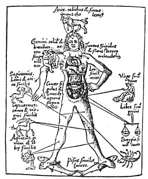The pagans believed that the zodiac formed the body of the Grand Man of the Universe. This body, which they called the Macrocosm (the Great World), was divided into twelve major parts, one of which was under the control of the celestial powers reposing in each of the zodiacal constellations. Believing that the entire universal system was epitomized in man's body, which they called the Microcosm (the Little World), they evolved that now familiar figure of "the cut-up man in the almanac" by allotting a sign of the zodiac to each of twelve major parts of the human body.