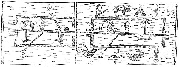 The two rectangular diagrams represent two degrees of the Mide lodge and the straight line through the center the spiritual path, or "straight and narrow way," running through the degrees. The lines running tangent to the central Path signify temptations, and the faces at the termini of the lines are manidos, or powerful spirits. Writing of the Midewiwin, Schoolcraft, the great authority on the American Indian, says: "In the society of the Midewiwin the object is to teach the higher doctrines of spiritual existence, its nature and mode of existence, and the influence it exercises among men. It is an association of men who profess the highest knowledge known to the tribes."