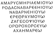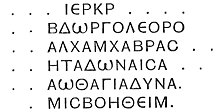 To come now to the actual remains of Gnostic manufacture, which preserve to us formulæ of the nature just considered, the most important, to judge from its frequent occurrence, and the evident care bestowed upon its engraving, is the one here transcribed. My copy is taken from an example formerly in the State collection, probably the finest talisman known. It is a thick plaque, somewhat heart-shaped, of dark garnet, 2¾ x 1½ inches in its greatest dimensions, bearing on the one side 14 lines, on the other 11, neatly cut in the Greek character in the third century but making no distinction between the Α and the Λ.