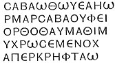 down from the celestial mansions that thou shouldest behold her naked, acknowledge her beauty, hear her speaking, and be astonished at her wisdom. Look up therefore at her head Α and Ω, at her neck Β and Ψ, at her shoulders with her hands Γ and Χ, at her breasts Δ and Ρ, at her chest Ε and ϒ, at her back Ζ and Τ, at her belly Π and Σ, at her thighs Θ and Ρ, at her knees Ι and Π, at her legs Κ and Ο, at her ankles Λ and Ξ, at her feet Μ and Ν. This is the body of Truth, this the form of the letters, this the character of the writing. Whereupon Truth looked upon me (Marcus) and opened her mouth, and uttered a word, and that word became a Name, a name which we know and speak--Christ Jesus: and having named him she held her peace." *