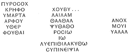 Foremost in the rank of Words of Power stands the "Mystery of the Seven Vowels," so important as to demand a separate section for its discussion with befitting reverence. Though inferior to these, great no doubt was the virtue of those interminable strings of letters that fill both faces of many a Gnostic stone--later refinements upon the celebrated Ἐφέσια Γράμματα, as Clemens aptly remarks. Amongst these interminable formulae lurk, no doubt, those potent spells composed by Solomon himself; by repeating which and at the same time applying to the sufferer's nose his ring (under whose gem was placed the herb prescribed by the same oracle of wisdom) the Jew Eleazar drew out through their nostrils the devils possessing many people, in the presence of Vespasian, his tribunes and chief officers. The sapient Josephus adds, that to make sure of the exit of the diabolical occupant, the exorcist commanded him to overturn in his flight a basin of water placed at a considerable distance, which was forthwith done, to the consternation and conviction of all the heathen spectators. The Ephesian Spell, the mystic words graven on the zone of the Great Diana, were commonly used by the Magi of Plutarch's times for the same purpose.