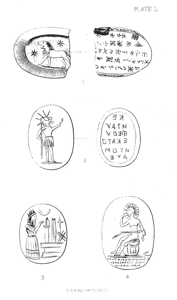 2. Lion-headed Man, doubtless a Leonticus (one of the grades in the Mithraic Mysteries), uttering, with uplifted hand, the inexplicable adjuration, "O, Centaur of God, Thou match for a hundred [demons]!" Here ἑκατοντομάχος is formed after the analogy of μονομάχος, "a match for one."