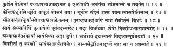Posture becoming established, a Yogî, master of himself, eating salutary and moderate food, should practise Prâṇâyâma, as instructed by his guru. 1.