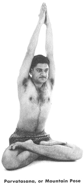 Maintain this slightly stretched, upright position between breaths, since this is the point at which attempts at upward stretching are most successful. During this exercise, keep your eyes fixed on some object before you and keep your mind at ease. This pose was named Parvatasana because it has the appearance of a mountain.
