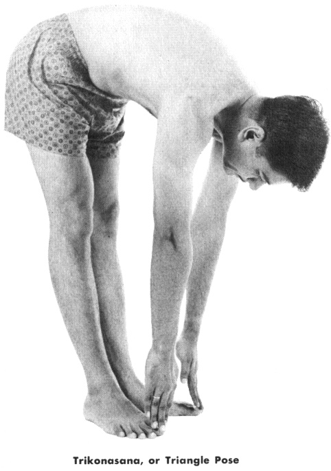 The Trikonasana will enable you to reach a state of physical suppleness and elasticity that will have a relaxing effect on your mental state. It is more difficult at first than the earlier poses, as it calls upon ordinarily unexercised muscles. Because of the exceptionally straight and full-length adjustments of the bony structure of the spine, this pose will correct many of the ailments due to misplaced internal organs and poor body tonicity. The dynamic variations of this pose will enhance its benefits considerably.
