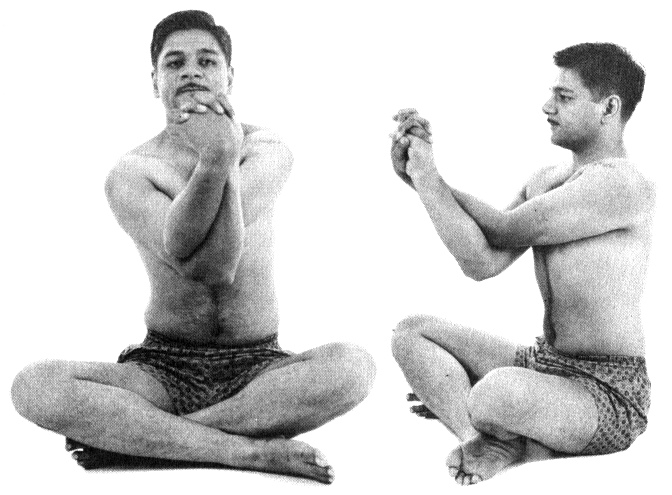 Do not force yourself into this pose until your limbs have gained sufficient suppleness. Then you should follow this time-plan: (1) Twist your body and exhale for five seconds; (2) maintain the pose as shown in the illustration and retain your breath for ten seconds (or you may with normal, rhythmic breathing hold the pose for not more than two minutes); (3) return to starting position and inhale for five seconds.