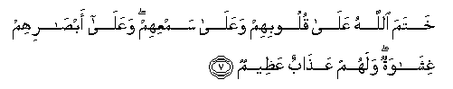 7. Khatama Allahu AAala quloobihim waAAala samAAihim waAAala absarihim ghishawatun walahum AAathabun AAatheemun
