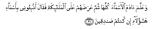 31. WaAAallama adama al-asmaa kullaha thumma AAaradahum AAala almala-ikati faqala anbi-oonee bi-asma-i haola-i in kuntum sadiqeena