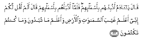 33. Qala ya adamu anbi/hum bi-asma-ihim falamma anbaahum bi-asma-ihim qala alam aqul lakum innee aAAlamu ghayba alssamawati waal-ardi waaAAlamu ma tubdoona wama kuntum taktumoona